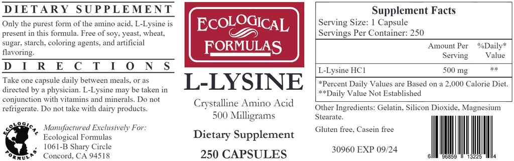 L-Lysine 500 mg by Ecological Formulas is a dietary supplement designed to help strengthen the immune system.* L-Lysine 500 mg by Ecological Formulas features lysine as its key ingredient, an essential amino acid that supports the immune system, in addition to facilitating the absorption of calcium, the formation of collagen in bone, hair, skin, connective tissue and cartilage, and in the production of healthy new bone tissue.*