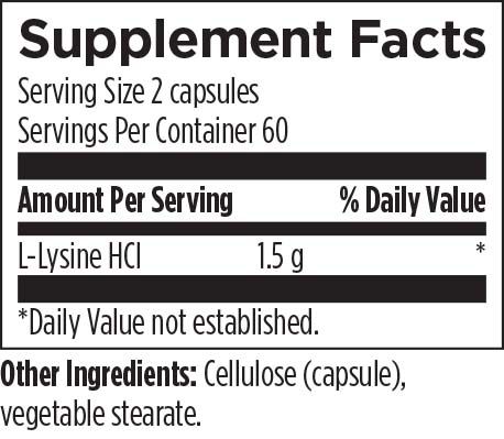 This product contains 1.5 g of the amino acid lysine in each two capsule serving. It offers lysine in the free form, meaning it is immediately available for absorption and can be put to metabolic use more readily and rapidly than the amino acids that are contained in dietary protein.