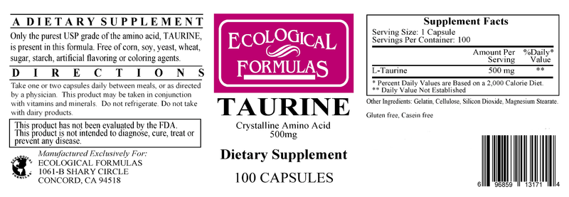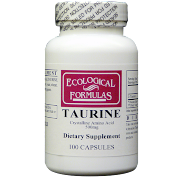 L-Taurine 500 mg by Ecological Formulas is a dietary supplement designed to support healthy heart function as well as promote healthy liver, kidney and immune system function.* The main ingredient in L-Taurine 500 mg by Ecological Formulas is the essential amino acid known as taurine, the by-product of amino acids cysteine and methionine. Although the body produces some amounts of taurine, supplementation is advisable, especially for vegans and vegetarians, who are often deficient in this vital amino acid that is essential for many physiological processes necessary for good health.