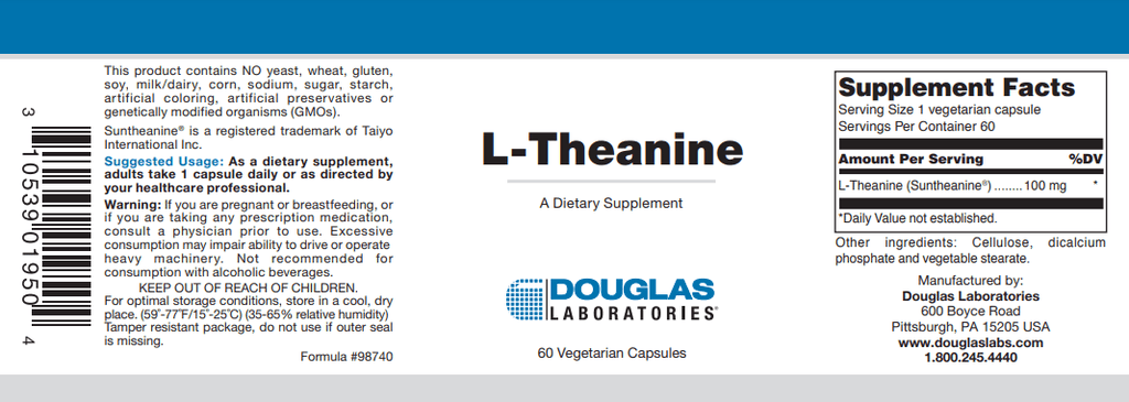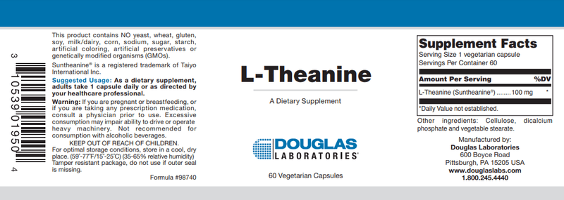 L-Theanine, provided by Douglas Laboratories, supplies 100 mg of pure L-Theanine in each vegetarian capsule.