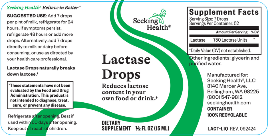 Lactase Drops by Seeking Health is an effective liquid lactase enzyme supplement that helps break down lactose, to help you enjoy dairy without suffering from bloating, gas, stomach aches, and other symptoms. Lactase Drops contain a lactase enzyme that breaks down lactose milk sugar into simpler sugars. Lactase Drops may be used by people of all ages, and the sweet-tasting liquid is much easier to administer to infants and children than unpleasant, hard-to-swallow lactase capsules or tablets.*