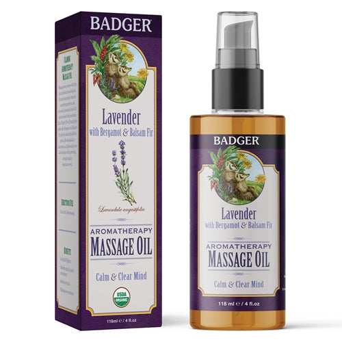 Calm & clear mind. Badger has infused silky smooth and deeply moisturizing cold pressed Olive and Jojoba Oils with harmonious blends of super-critical plant extracts and essential oils to soothe mind and body. Experience the power of this aromatherapy massage oil packed with naturally occurring vitamins, antioxidants and skin soothing nutrients. Lavender Aromatherapy Massage Oil with Bergamot, Balsam Fir, Ginger and more promotes complete mind and body relaxation anytime - on the massage table, after shower, or before bedtime. This lighter-bodied oil is packed with essential oils that promote relaxation and clarity, helping you to stay calm and focused.