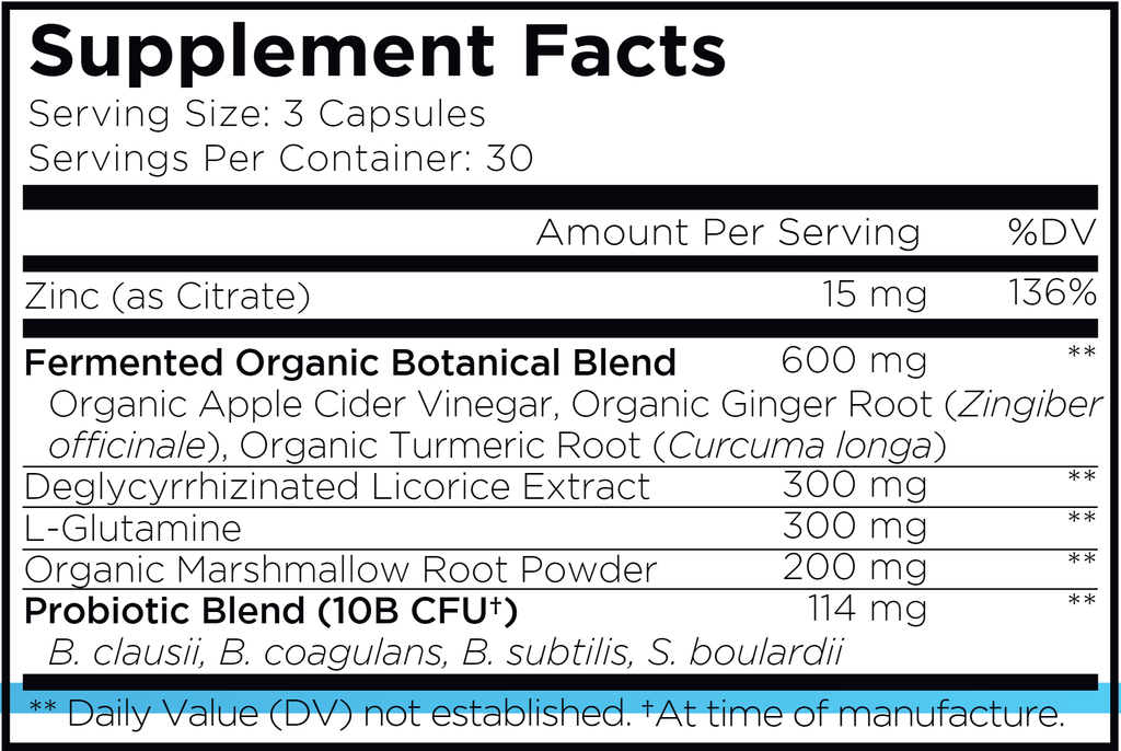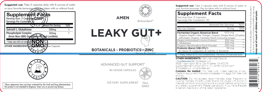 Amen Leaky Gut + is an all-in-one digestive supplement that features bioavailable L glutamine, zinc, organic turmeric, organic ginger root, licorice extract, and organic marshmallow root along with a blend of probiotics in an easy to use capsule format.*