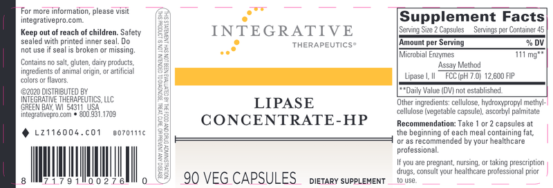 Lipase is a microbial enzyme that aids in the digestion of fats.* Lipase Concentrate-HP is pH-stable and active in both acid and alkaline conditions. As a result, this formula supports the digestion of fats in gastrointestinal pH conditions.*