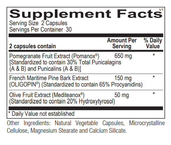 Pomanox™ Pomegranate Extract†: Pomegranate fruit contains a unique class of polyphenols called punicalagins. Pomanox™ a unique pomegranate extract, uses a propriety extraction method producing a polyphenol spectrum corresponding to whole fresh pomegranates, enabling natural synergy between PC and other pomegranate polyphenols which helps maintain cardiovascular health. These compounds possess strong antioxidant properties which support nitric oxide production by stimulating AKT/eNOS axis, supporting endothelial function.