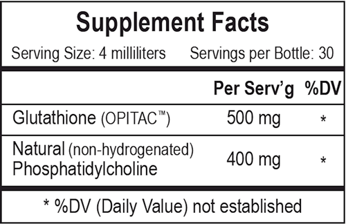 True Liposomal Glutathione with 500 mg glutathione and 400 mg phosphatidyl choline per dose!