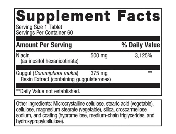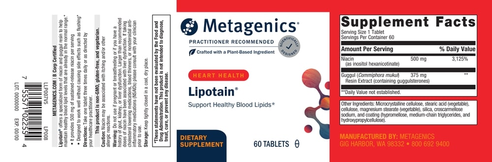 Lipotain ® is a formula designed to help maintain healthy blood lipids by supplying 500 mg of niacin as inositol hexanicotinate per serving. This unique, sustained-release form of niacin is formulated to be effective without the uncomfortable adverse effects associated with conventional niacin, such as flushing. Lipotain also features a standardized extract of guggul resin, to support healthy blood lipid levels already in the normal range and complement the activities of inositol hexanicotinate.*