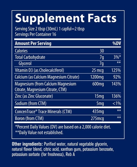 Liquid Cal/Mag/Zinc is a perfectly balanced daily liquid supplement of calcium, magnesium, zinc and vitamin D synergistically formulated to support bone, muscle and connective tissue health.*