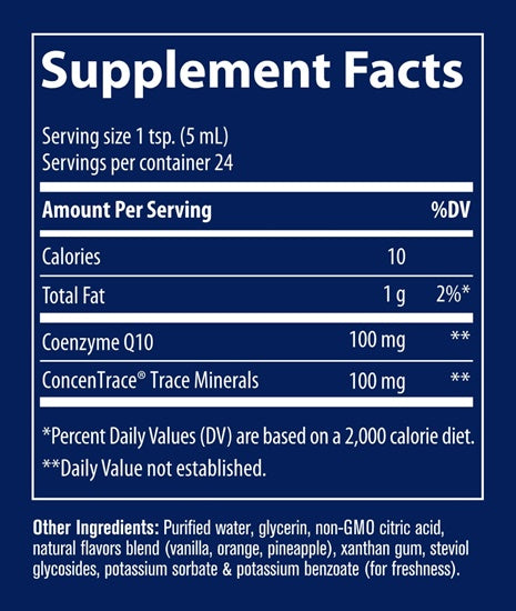 Liquid CoQ10 is a unique formula that provides 100 mg per serving of CoQ10 that is then supercharged with ConcenTrace®, a concentrated complex of over 72 naturally occurring ionic trace minerals from the Great Salt Lake.
