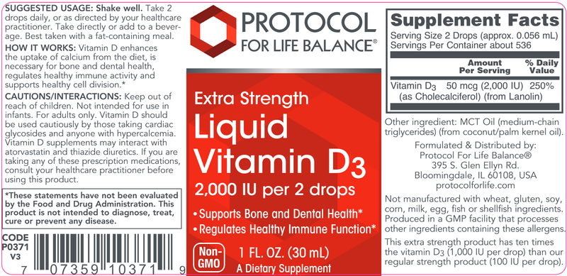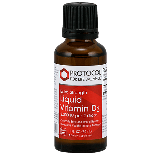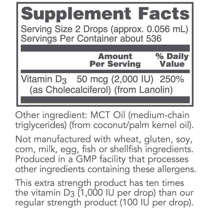 Vitamin D enhances the uptake of calcium from the diet, is necessary for bone and dental health, regulates healthy immune activity and supports healthy cell division. This extra strength product has ten times the vitamin D3 (1,000 IU per drop) than our regular strength product (100 IU per drop).