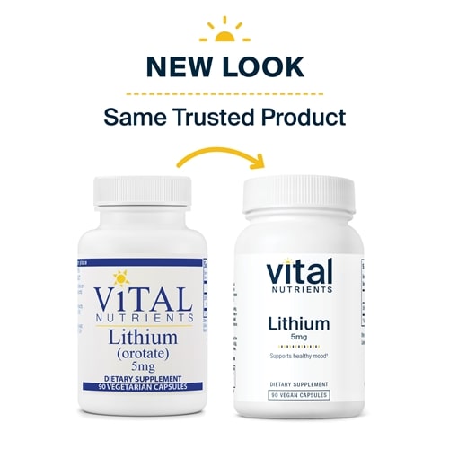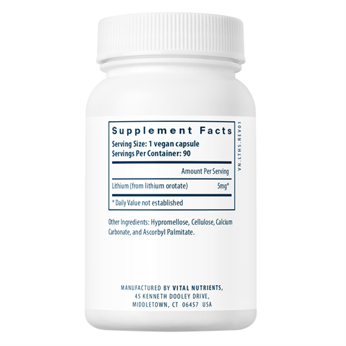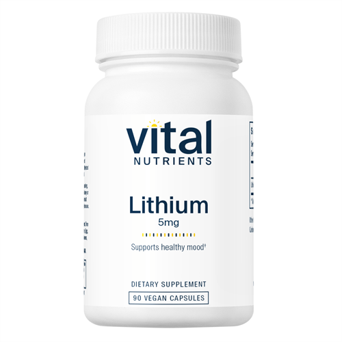 Lithium is an alkali metal found in trace amounts in most rocks, mineral springs, ocean water, and nearly all vertebrate tissue. Vital Nutrients provides low-dose lithium as lithium orotate, a highly bioavailable form. Lithium supports the phosphoinositol pathway and may promote a healthy balanced mood and behavior. Additionally, it may help resist the mental and physical effects of stress. Lithium orotate enhances the transport of Vitamin B12 and Folate into L1210 brain cells, further supporting mental and behavioral health.*