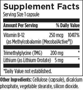 The addition of vitamin B12 and TMG to Lithium Synergy helps support healthy methylation pathways. Due to genetic factors, many individuals do not have robust methylation, and effective methylation is critical for producing some of the neurotransmitters and other compounds involved in maintaining healthy, balanced moods. Vitamin B12 is required for the synthesis of SAMe, which is a “methyl donor” that facilitates methylation reactions. Additionally, sufficient B12 status is paramount for cognitive function and maintaining good physical energy levels, which may be compromised in individuals with occasional changes in moods. Maintaining adequate