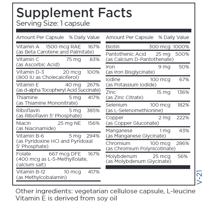 Source Materials: Vitamin A palmitate, thiamine mononitrate, niacinamide, pyridoxine HCl, pyridoxal 5 phosphate, L-methylfolate, biotin, and pantothenic acid: synthetic. Natural mixed carotenoids: carrot and marigold extracts. Ascorbic acid: corn sorbitol. Vitamin D3: lanolin from sheep’s wool. Vitamin E succinate: purified soy oil. Riboflavin 5 phosphate and methylcobalamin: dextrose fermentation. Mineral are mined. Chelating agents include: glycine (synthetic), citric acid (corn fermentation), methionine (synthetic), glucuronic acid (synthetic). L-leucine: fermentation. Cellulose for capsules is derived from softwood tree pulp.