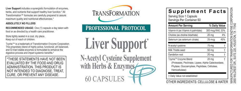 Transformation’s Professional Protocol™ Liver Support is a N-Acetyl Cysteine supplement with herbs and enzymes to promote liver health and healthy detoxification.*