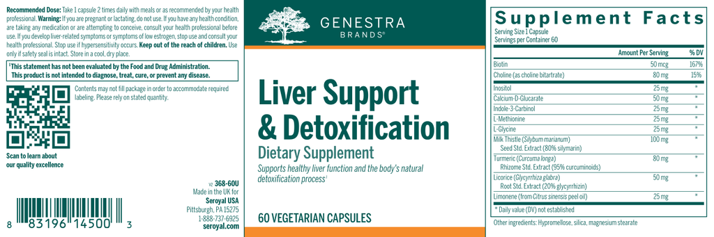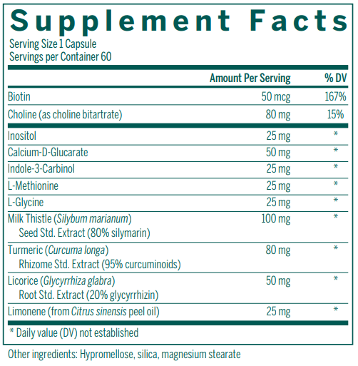 Liver Support and Detoxification provides a combination of nutrients and herbs that promote liver health. The liver is the primary site for the detoxification of metabolic waste products. Certain waste products, along with reactive oxygen species, can be toxic to liver cells. Research demonstrates that milk thistle promotes liver health by increasing the activity of detoxifying enzymes in the liver. Along with active ingredients in turmeric and licorice, milk thistle supports and enhances the body’s antioxidant defense system. Milk thistle and licorice also promote a healthy cytokine balance to further maintain liver health. In a randomized, placebo-controlled trial, daily supplementation with 140 mg of silymarin (the primary bioactive in milk thistle) for two months significantly promoted healthy levels of the liver enzymes alanine transaminase (ALT) and aspartate transaminase (AST), two important clinical markers of liver health. Lipotropic compounds, including choline and L-methionine, are also included to support healthy lipid metabolism in the liver.