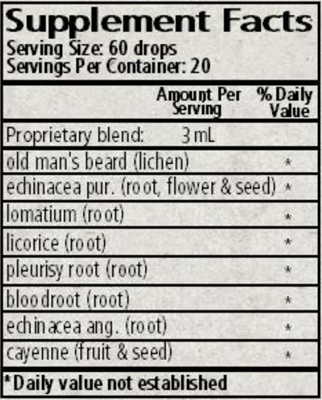 Ingredients: Proprietary Blend 3ml, Old man's beard, echinacea, lomatium, licorice, pleurisy root, bloodroot and cayenne in a base of organic cane alcohol, mountain spring water, and vegetable glycerine.