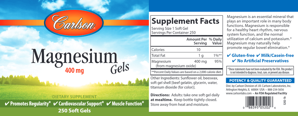 Although we don't hear much about magnesium, it's an essential mineral for hundreds of chemical reactions in our body. And, it's estimated that up to 75% of us don't get enough through diet alone. Magnesium Gels provide 400 mg of magnesium in a single soft gel, which supports healthy blood vessels and promotes healthy muscle function. When used together with calcium, it helps to maintain healthy bones.