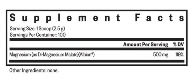 Magnesium Malate Powder by Seeking Health provides 500 mg of magnesium (as dimagnesium malate) per serving. Magnesium is an abundant mineral naturally present in the body that acts as a cofactor in hundreds of enzymatic processes and systems. It helps to regulate biochemical reactions in the body, including protein synthesis, muscle and nerve function, and healthy blood pressure. It may help support healthy muscle relaxation by inhibiting calcium influx and smooth muscle contraction.