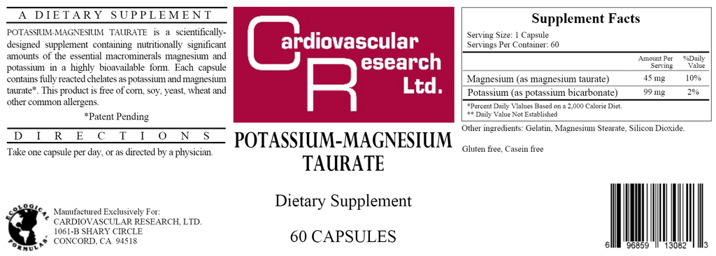 Magnesium-Potassium Taurate by Ecological Formulas is a dietary supplement designed to support healthy cardiovascular function.* There are two key minerals contained in Magnesium-Potassium Taurate by Ecological Formulas that promote the ongoing good health of the cardiovascular system.* These are magnesium, responsible for supporting the nervous system in addition to promoting the healthy contraction and relaxation of muscles, combined with potassium, vital for helping maintain a healthy balance of fluids in the body in addition to maintaining healthy blood pressure already in the normal range.*