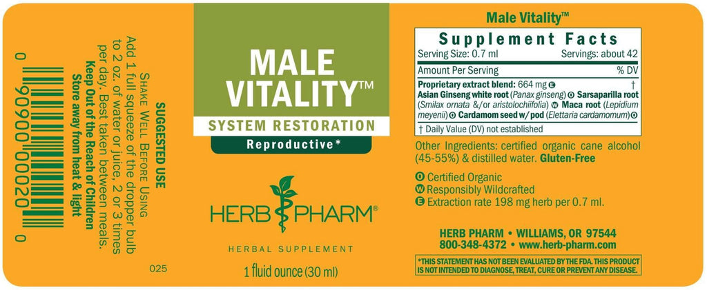 Male Vitality features Asian Ginseng extract prepared from the roots of Certified Organic Panax ginseng plants. It also features Maca prepared from the dried root of Certified Organic Lepidium meyenii plants. Our Maca is grown for us at an altitude of 12,000 to 15,000 feet in the central highlands of Peru.