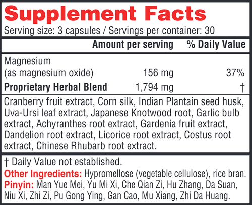 Promotes urinary tract health, combining cranberry fruit extract with traditional Chinese herbs that support the lower burner and drain dampness.