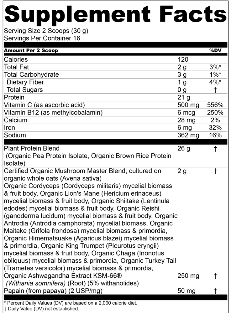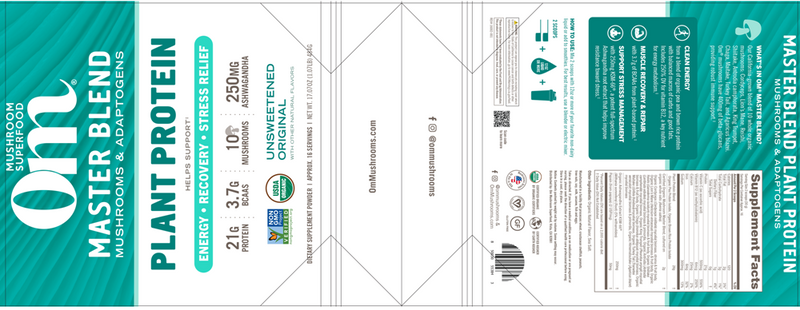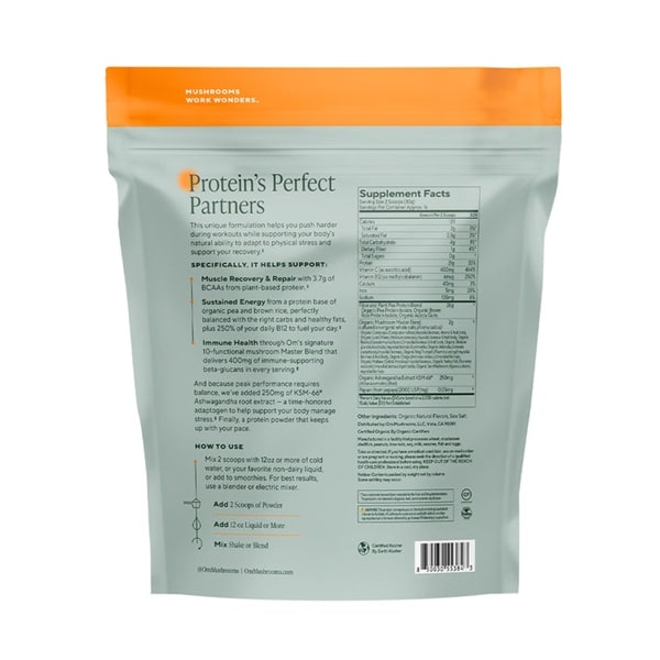 Om’s Unsweetened Original Master Blend Plant Protein is super-powered with mushrooms and adaptogens to help support energy, recovery and stress relief.‡ This unique blend is loaded with 2g of mushrooms, 21g of plant-based protein, 250mg of KSM-66® Ashwagandha, plus Vitamin C & B12. The unsweetened, original flavor makes a perfect blank canvas for your favorite smoothies and recipes.