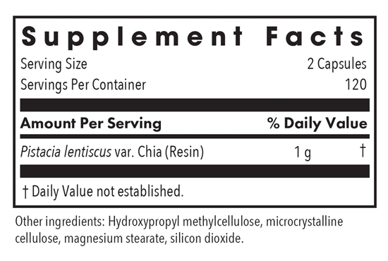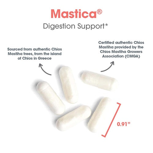 Mastic gum is a plant-derived resin from the Pistacia lentiscus tree with traditional use.* Containing phenolic compounds, mastic gum supports digestive health, microbial balance, immune function, and cardiovascular wellness.* Clinical trials have shown that daily supplementation helps promote gastrointestinal comfort, healthy motility, and cardiovascular biomarkers within normal limits.* Mastica provides one gram of mastic gum per two capsules.