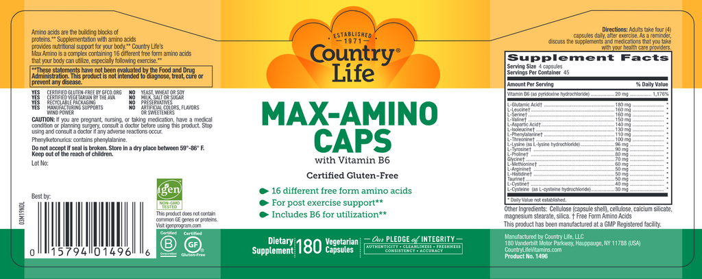 Regular exercise is essential for a healthy mind and body; however, post-workout muscle recovery is just as-if not more- important.** Amino acids are micronutrients that help support our cells during recovery.** Max-Amino contains a comprehensive formula of 16 different free-form amino acids, which are bioavailable, easily absorbed, and focused on powering your body.** B6 aids in the absorption process.**