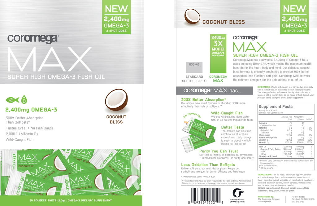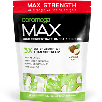 Each serving of Coromega Max has a powerful 2,400 mg of Omega-3 fatty acids including DHA (850 mg) + EPA (1250 mg) which means maximum health benefits for the heart, body and mind.* Coromega's delicious Squeeze Shot formula and flavor is uniquely emulsified to provide a clinically 300% better absorption over standard soft gels.