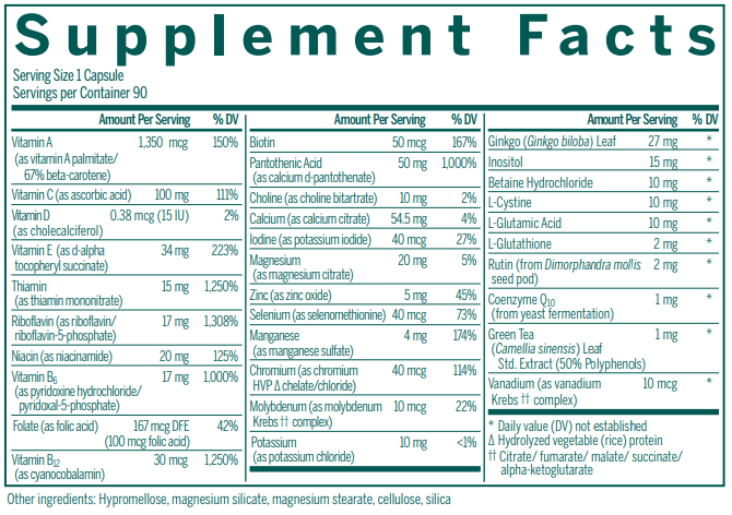 Contains a wide range of antioxidants to assist and promote overall health including rutin, coenzyme Q10 and green tea extract.