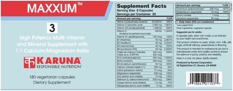 MAXXUM 3 is iron-free and formulated for health practitioners seeking a 1:1 ratio of calcium to magnesium, in the optimal citrate:malate formulation identified in clinical studies. MAXXUM 3 is the right choice for patients preferring a capsule delivery system in a high-quality, iron-free multi that supports bone health.