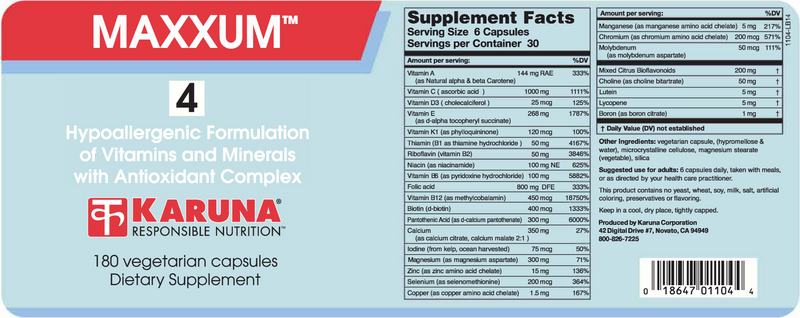 MAXXUM 4 is a comprehensive iron-free multi with an advanced antioxidant and flavonoid complex for free radical scavenging. Broad antioxidant support includes lutein and zeaxanthin for macular health, lycopene for cellular wellness, and alpha-carotene and cryptoxanthin for lung health.* Citrus bioflavonoids complement the absorption of vitamin C.