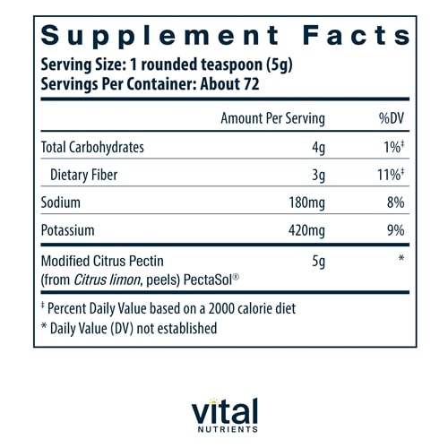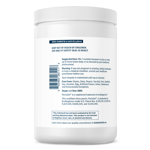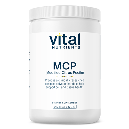 MCP (Modified Citrus Pectin), also known as fractionated pectin, is a complex polysaccharide derived from the peel and pulp of citrus fruits. It is rich in short galactose carbohydrate chain residues that help maintain normal cell and tissue health while promoting a healthy immune system. Vital Nutrients MCP Powder provides PectaSol-C®, produced using a scientifically validated proprietary process that carefully controls both the molecular weight and degree of esterification for optimal absorption into the bloodstream. This process ensures maximum efficacy in supporting cellular health and immune function.