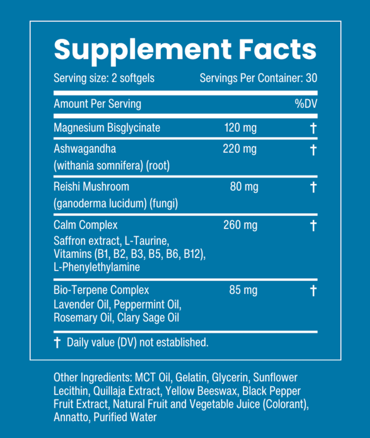 Suggested Use: Take 2 softgels at the start of your day or at any point you feel an onset of stress or anxiety. You may take up to 6 softgels per day 4-6 hours apart.