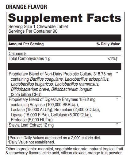 Mega Probiotic ND with Digestive Enzymes Chewable is a comprehensive and completely vegetarian supplement designed to support digestive tract function and nutrient absorption.* It contains non-dairy probiotics and a broad-spectrum of enzymes that work together to support digestion and GI tract health.* Mega Probiotic ND with Digestive Enzymes Chewable is vegetarian and ideal for people of all ages.* Each chewable tablet provides 2.5 billion beneficial microorganisms along with Amylase, Bromelain, lactase, Lipase, Protease and cellulose in a delicious, natural orange flavored chewable tablet.