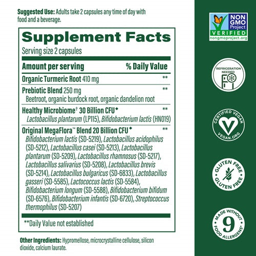 MegaFlora with Turmeric (formerly know as MegaFlora over 50) contains Bifidobacterium lactis (HN019) and Lactobacillus plantarum (LP115) to promote regularity, healthy bowel function and proper digestion for reduced gas and bloating in addition to Megafood's signature blend of 14 unique strains of probiotics from 50 billion active bacteria.* FoodState® Turmeric Root helps maintain an already healthy inflammatory response of the colon, and Megafood FoodState Prebiotic Blend encourages the growth of healthy gut bacteria.* Just like all MegaFood® supplements, MegaFlora with Turmeric is tested free from gluten, dairy and soy, and certified glyphosate residue free! Megafood recommend storing your MegaFlora in the fridge or freezer, and taking it once daily with a meal.