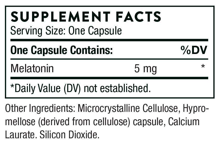 Melatonin administration from 0.3 mg to 5.0 mg has been shown to exert a sedative-like effect.* When supplemented prior to the onset of the body's normal melatonin secretion, even a low amount of melatonin can promote sleep.* Melatonin apparently enhances the effect of gamma-aminobutyric acid (GABA) via direct interaction with GABA receptors, thus resulting in relaxation.* Thorne's Melaton-3 supplies three mg of melatonin in each capsule, and Melaton-5 supplies 5 mg per capsule and is used when a higher amount of melatonin is desired. Melatonin also has significant antioxidant activity.* Adequate melatonin levels have been reported to be a positive factor in cardiovascular, neuroendocrine, GI, and bone health.*