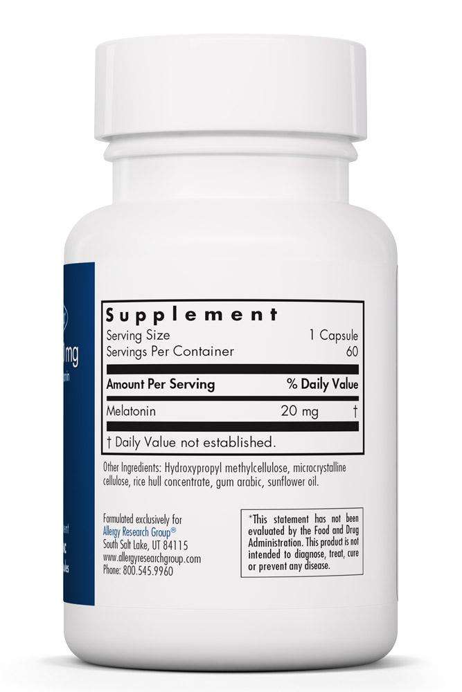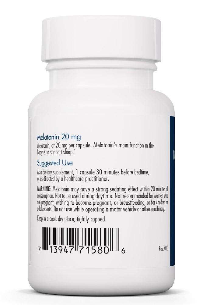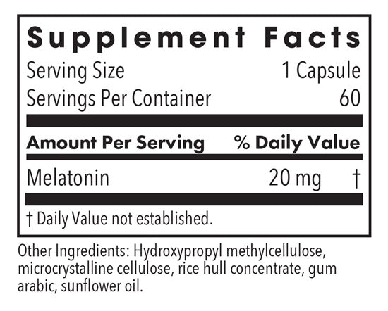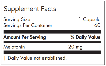 Melatonin, in capsule form and having a 20 mg per capsule strength. Melatonin's main function in the body is to support sleep. It also has antioxidant properties via hydroxy radical scavenging. The use of high purity melatonin is very important to insure safety.