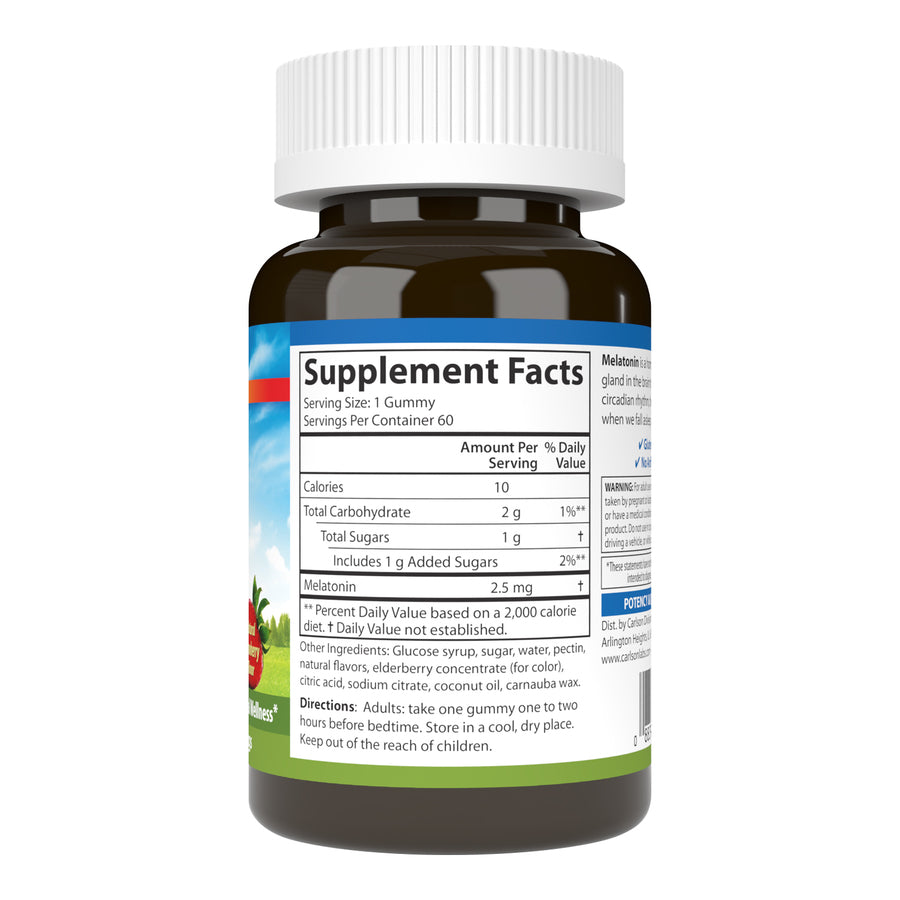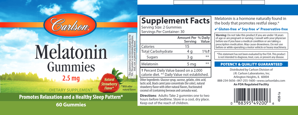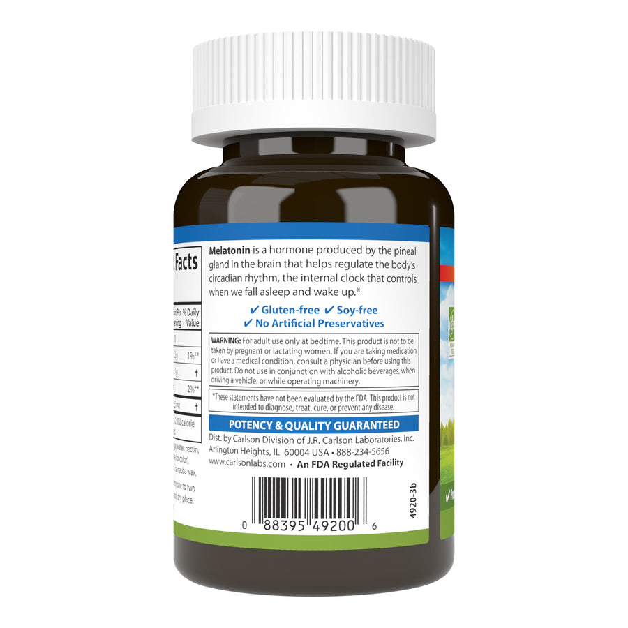 Melatonin, a hormone produced by the pineal gland in the brain, helps regulate the body's circadian rhythm, the internal clock that controls when we fall asleep and wake up. When it's dark, our body makes more melatonin. When it's light, our melatonin levels taper off. Disruptions in the sleep-wake cycle can occur for a variety of reasons, including bedtime light exposure from a tablet or smartphone, jet lag, changing seasons, working later hours, and poor vision. Melatonin production also decreases as we age. Carlson Melatonin promotes relaxation and a healthy sleep pattern, so you can fall asleep and stay asleep. Our all-natural gummy form makes them a convenient, tasty bedtime snack. Help restore your body clock, so you can sleep soundly and wake up feeling rejuvenated.