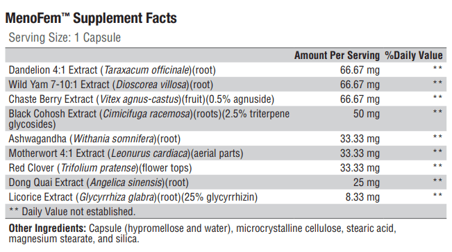 MenoFem™ is a unique formula integrating Native American, Chinese, and Ayurvedic herbs to provide balanced support to menopausal women.*