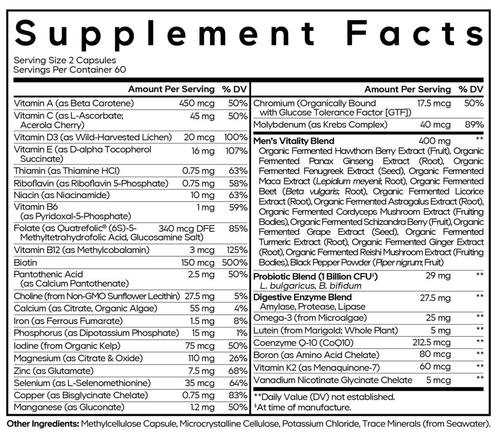Codeage Men’s Daily Multivitamin is designed specifically for men. This premium formula offers 25+ daily vitamins and minerals in an all-in-one solution. Their supplement is made with real whole foods and offers probiotics, fermented vitamins, enzyme-activated minerals, fruits, vegetables, and a men’s vitality blend. This advanced solution includes vegan vitamin A beta carotene, plant based vitamin C acerola cherry, vegan vitamin D3, vitamin E from tocopherol, K2, and methylated B-Complex (folate, B6, B12, biotin). The formula features essential minerals such as calcium, copper, manganese, magnesium, potassium, selenium, iodine, zinc, vegan omega-3 from microalgae, CoQ10, lutein & more.