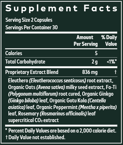 Each 2-capsule serving delivers 2,500 mg dry herb equivalent.