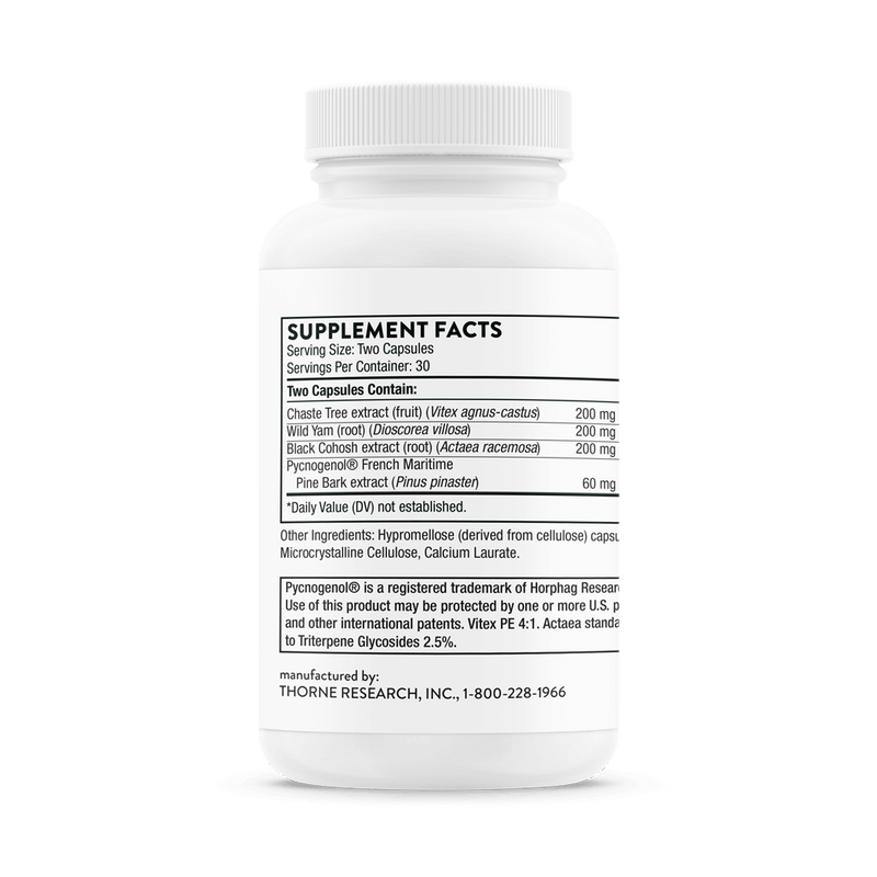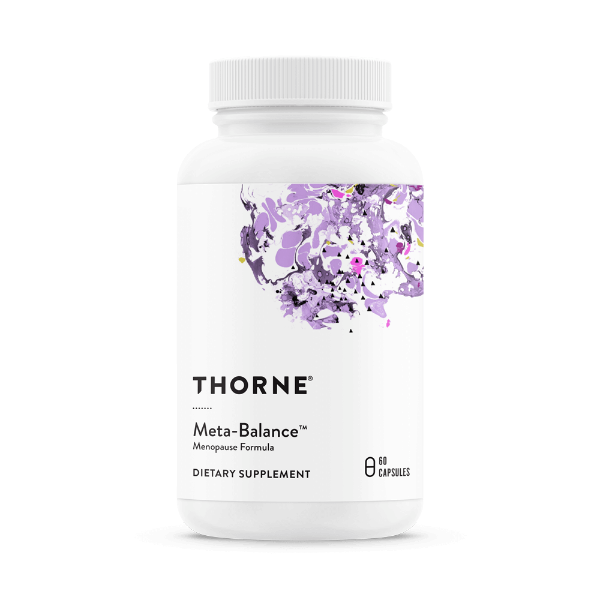 Thorne’s Meta-Balance provides an all-natural approach for women’s hormonal harmony without the side effects associated with conventional hormone replacement therapy. The botanical formula includes unique, well-studied ingredients – chaste tree and black cohosh extracts, wild yam, and Pycnogenol from French maritime pine bark – a synergistic blend ideal for women experiencing cyclical, perimenopausal, or menopausal symptoms by helping balance both estrogen and progesterone levels.