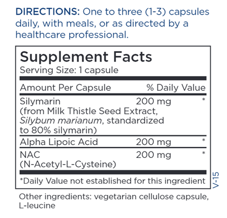 Our Metabolic Detox® capsules combine the active ingredient silymarin (isolated from the classic liver-supporting botanical, milk thistle) with other naturally occurring thiol antioxidants, N-acetyl-cysteine (NAC) and alpha lipoic acid (ALA). Silymarin expresses membrane-stabilizing and antioxidant activities, promotes regeneration of the liver, reduces inflammatory reactions, and inhibits fibrogenesis. NAC inhibits hepatocyte apoptosis and oxidative stress pathways and is a precursor for (and regulator of) glutathione synthesis. ALA is an amphipathic, metabolic antioxidant and detoxification agent, and decreases lipogenesis in the liver.