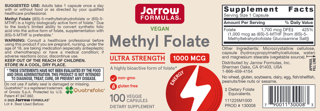 Methyl Folate ((6S)-5-methyltetrahydrofolate or (6S)-5-MTHF) is a highly biologically active form of folate. Due to the body’s limited ability to transform synthetic folic acid into the active form of folate, supplementation with 5-MTHF is highly preferable.