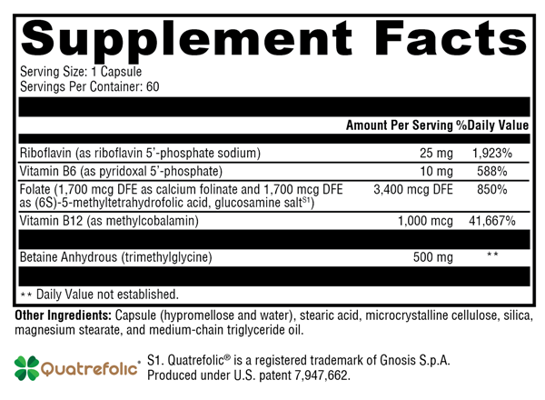 Methyl Protect® is a comprehensive formula designed to support optimal methylation and help maintain healthy homocysteine levels already within normal range. It features five key nutrients that are involved in homocysteine metabolism: folate as calcium folinate and Quatrefolic® for increased bioactivity; trimethylglycine; and vitamins B12, B6, and B2. These five nutrients, provided in activated forms, support enhanced methylation and overall cardiovascular health.*