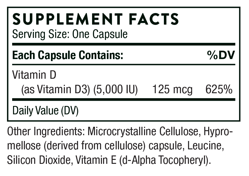 D-5,000 provides 5,000 IUs of vitamin D per capsule. Vitamin D is an essential nutrient for one of the pathways involved in homocysteine metabolism and methylation.* In addition to supporting healthy bones and muscles, vitamin D supports cardiovascular health and immune function.*