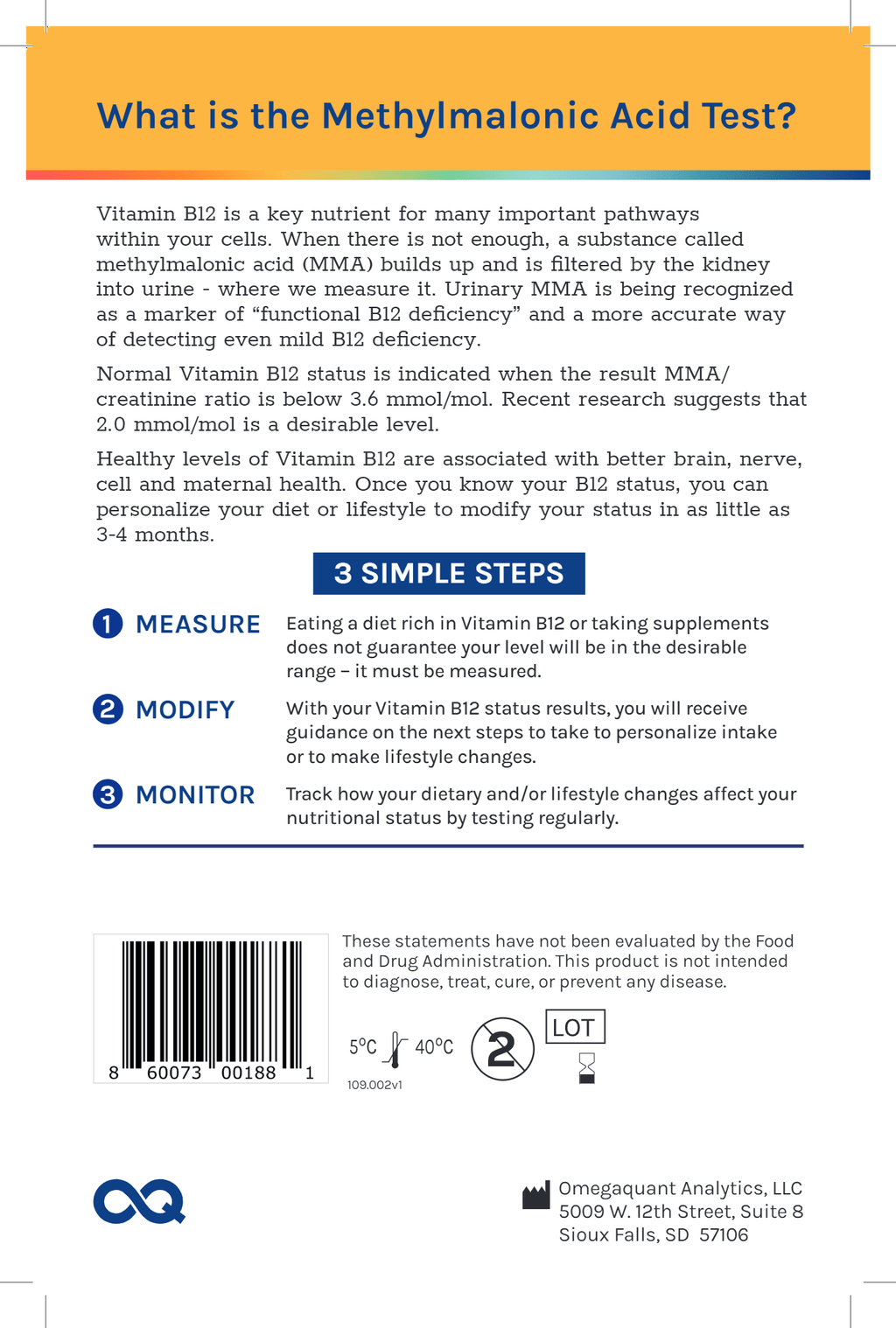 The urinary Vitamin B12 test measures a substance called methylmalonic acid (MMA) in the urine, which is a specific indicator of low B12 status. The more MMA you have, the more likely you are to be low in vitamin B12.