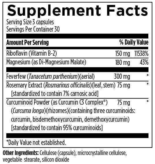 Migranol™ contains an extract of feverfew, a traditional herb that has been used since the first century known for its ability to support a healthy inflammatory response.* Curcuminoids and rosemary are also included for their phytonutrient properties and their role in supporting a balanced inflammatory response.* Magnesium is added for its effects on muscle relaxation.*