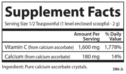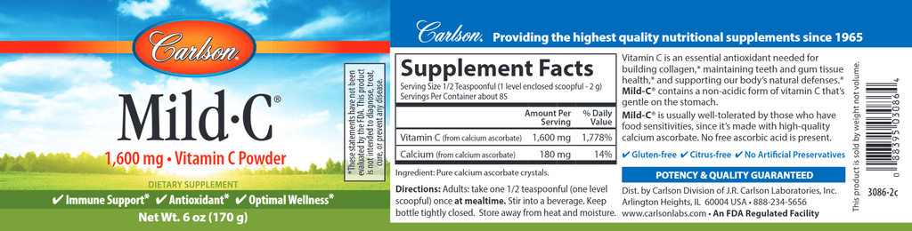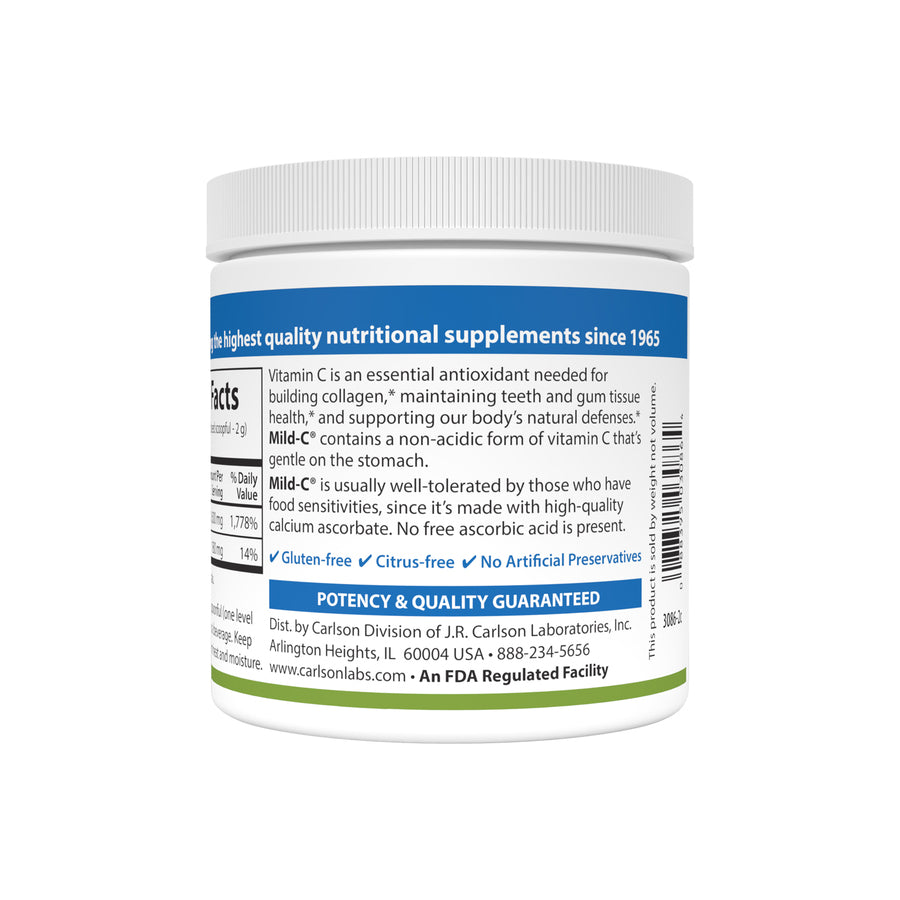 Vitamin C is an essential antioxidant that supports healthy immune system function, teeth, and gum tissue health, and the body's natural defense system. Carlson Mild C® Powder is made from pure calcium ascorbate, a combination of calcium and vitamin C, making it mild on the teeth and gentle in the stomach. Each 1/2 teaspoon contains 1,600 mg of vitamin C. Mild-C® Powder can be placed in water or a flavored drink.